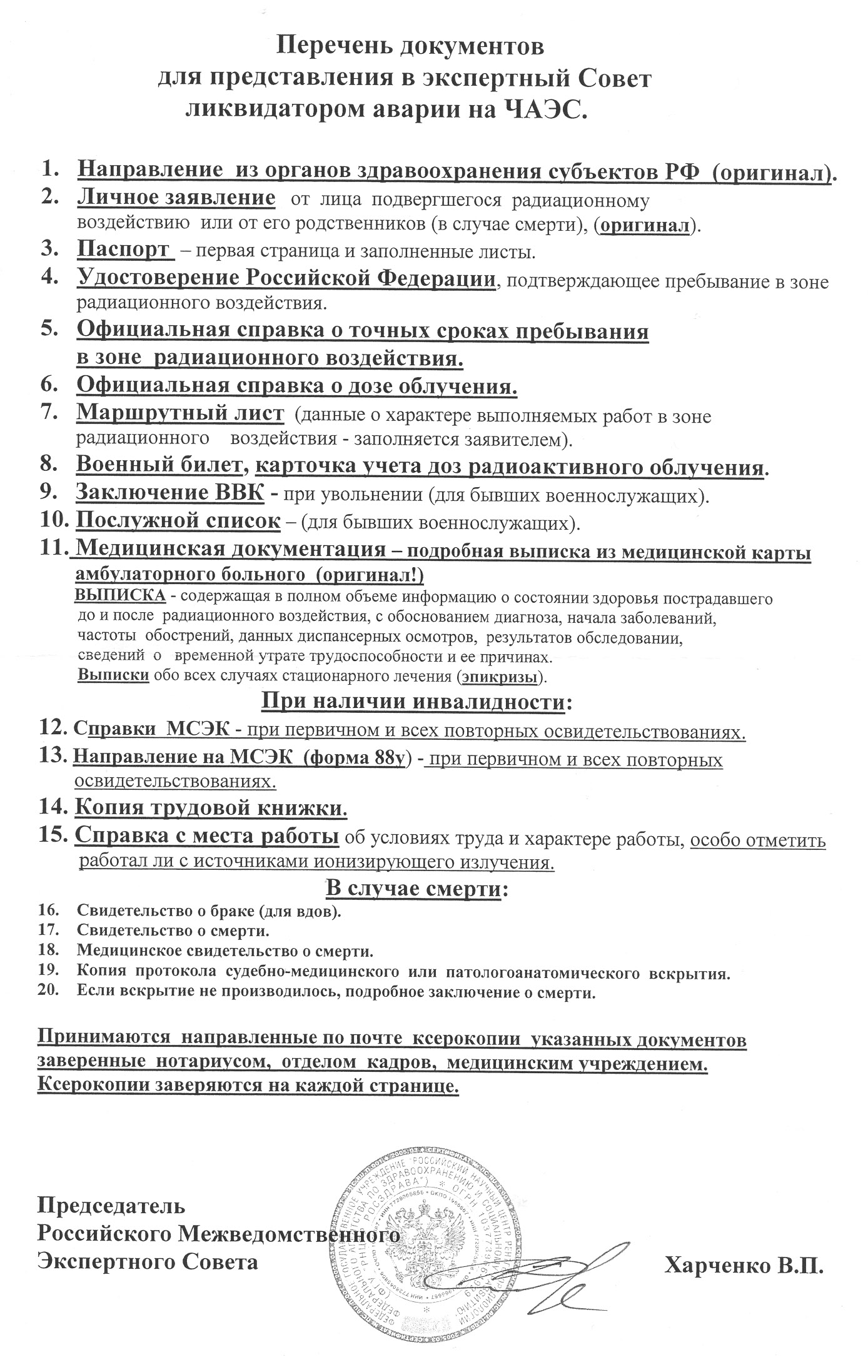 9. Перечень документов для представления в экспертный Совет ликвидатором аварии на ЧАЭС (скачать)